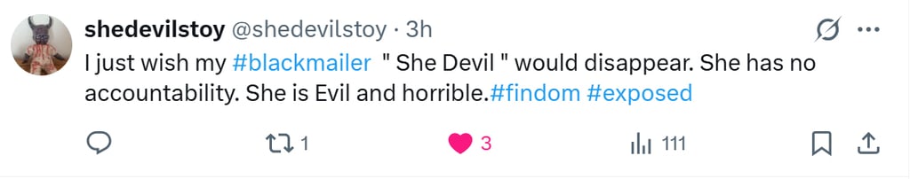 "I just wish my blackmailer She Devil would disappear. She has no accountability. She is Evil and horrible."